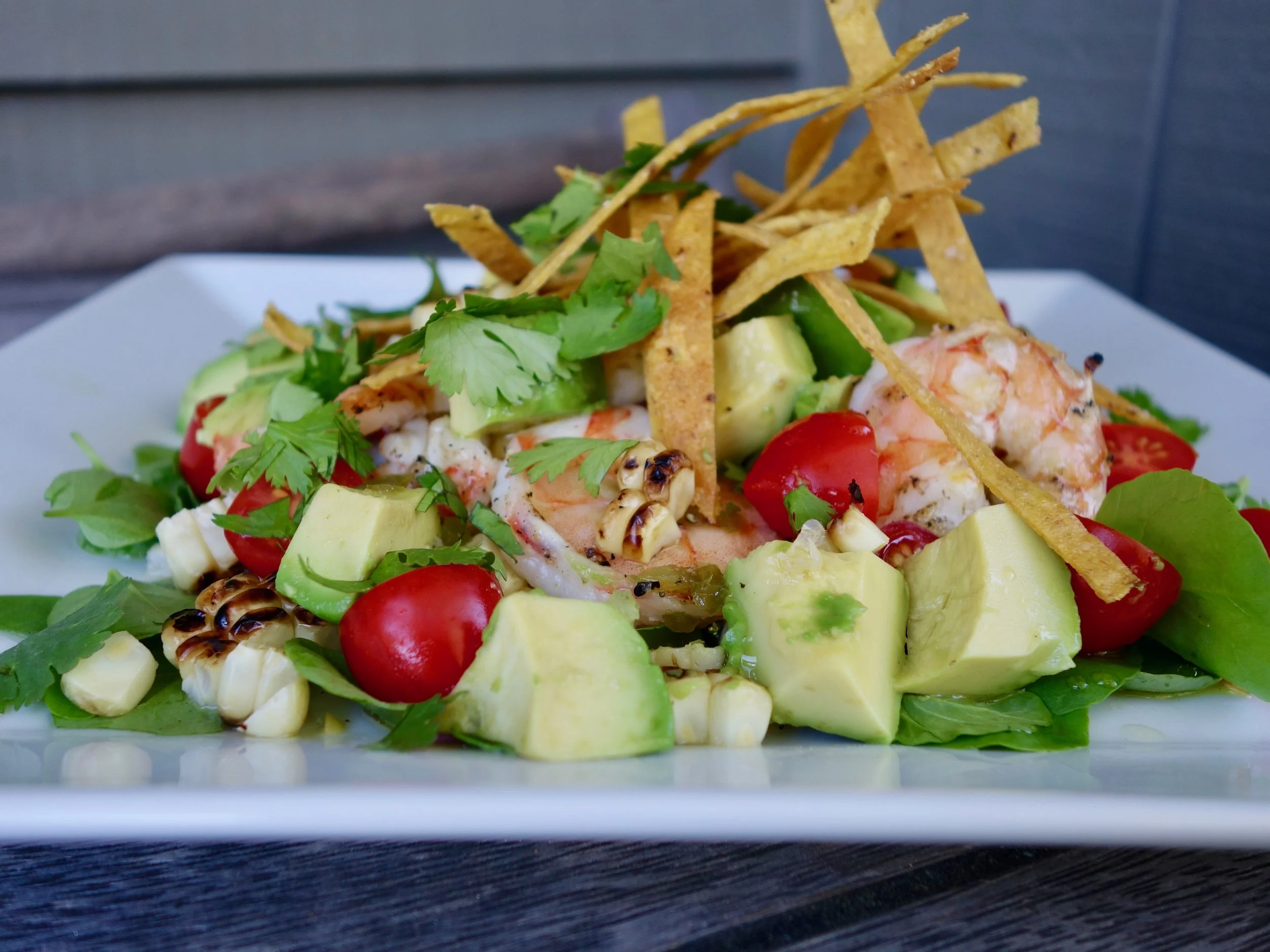 Construct the salads with a layer of Mixed Greens or Iceberg Wedge then add Shrimp, Avocado, Tomatoes and Corn kernels.