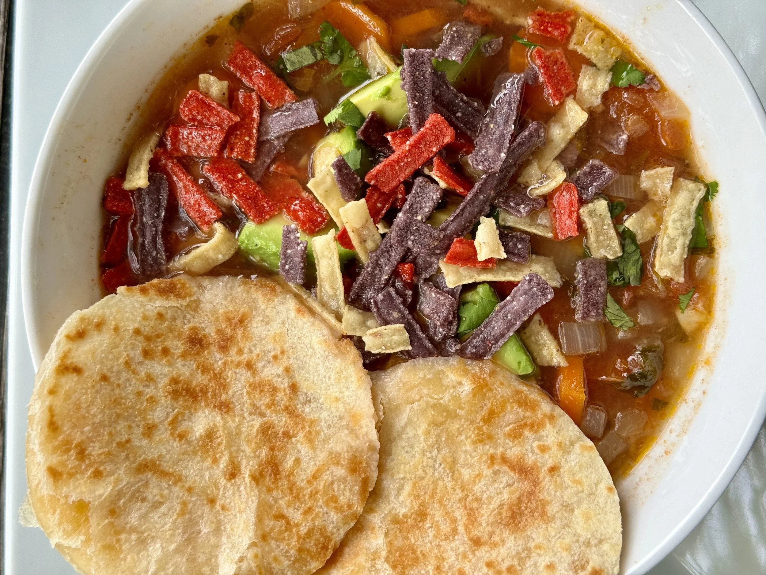 Garnish with Tortilla strips and fresh Cilantro leaves.